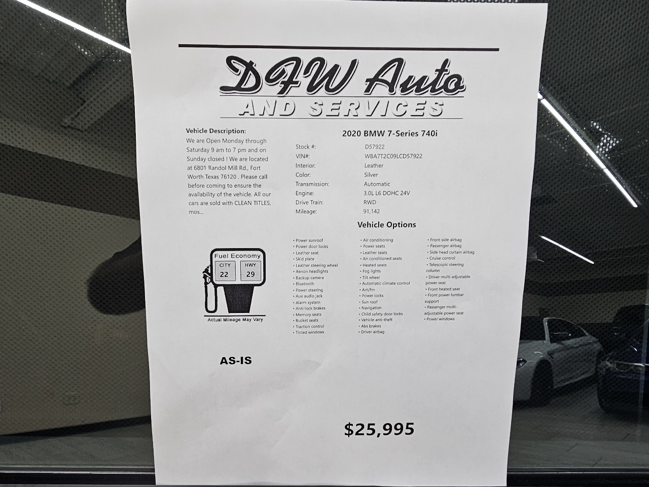 We are Open Monday through Saturday 9 am to 7 pm and on Sunday closed ! We are located at 6801 Randol Mill Rd., Fort Worth Texas 76120 . Please call before coming to ensure the availability of the vehicle. All our cars are sold with CLEAN TITLES, most being one owner cars! All vehicles are sold As-Is. They are priced low to sell fast. So don’t miss your chance. Test drive one today! Call anytime for more information about our cars!! Warranty available!. Priced wholesale to the public. Also, you can get a FREE Carfax report for every vehicle within seconds, when you visit www.dfwautotx.com